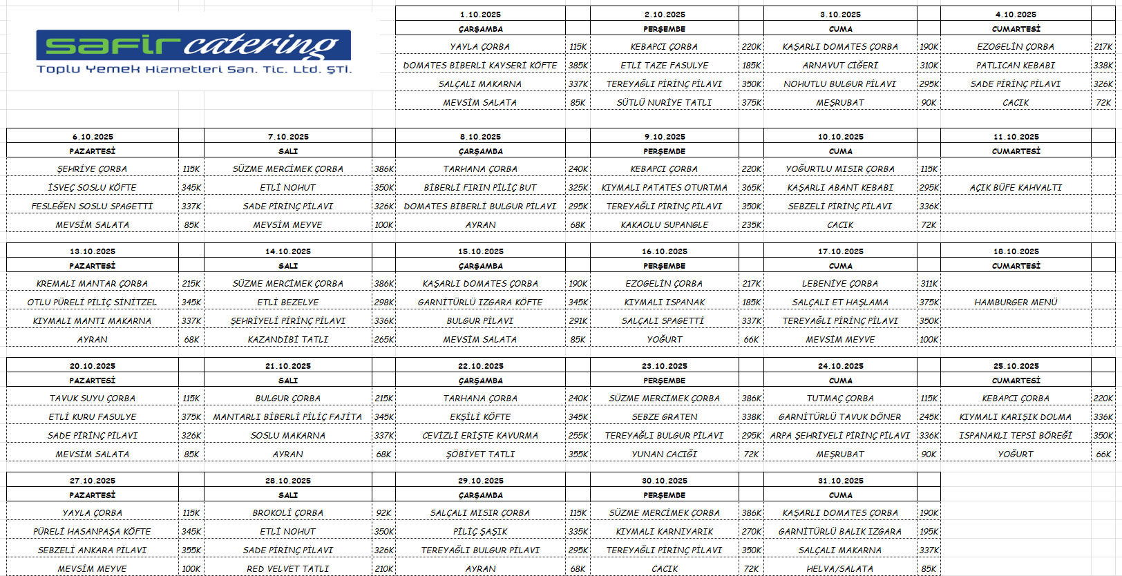Safir Catering Ekim Ayı 2025 Yemek Listesi