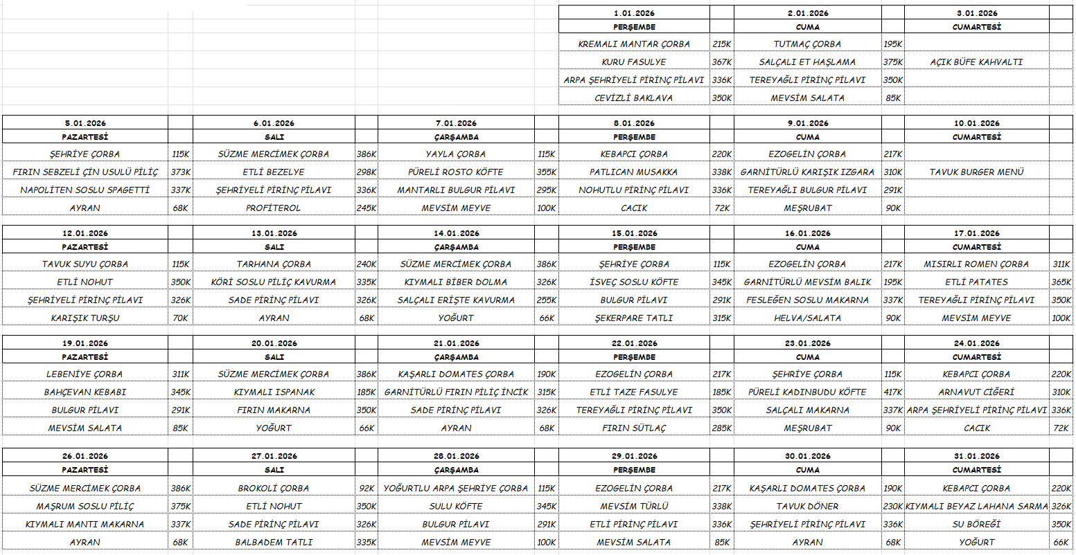 Safir Catering Ocak Ayı 2026 Yemek Listesi